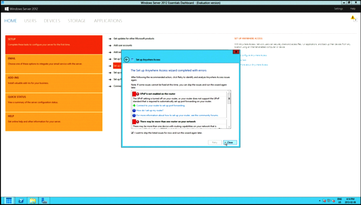 Chances are you’ll get this massive error log after you hit next. This happens if your router doesn’t support Universal Plug and Play (UPnP), something we painstakingly learned using WHS 2011. The way around this is to simply port-forward and set your router manually. Even then, Windows Server 2012 will report these exact same errors, but we can ignore them.