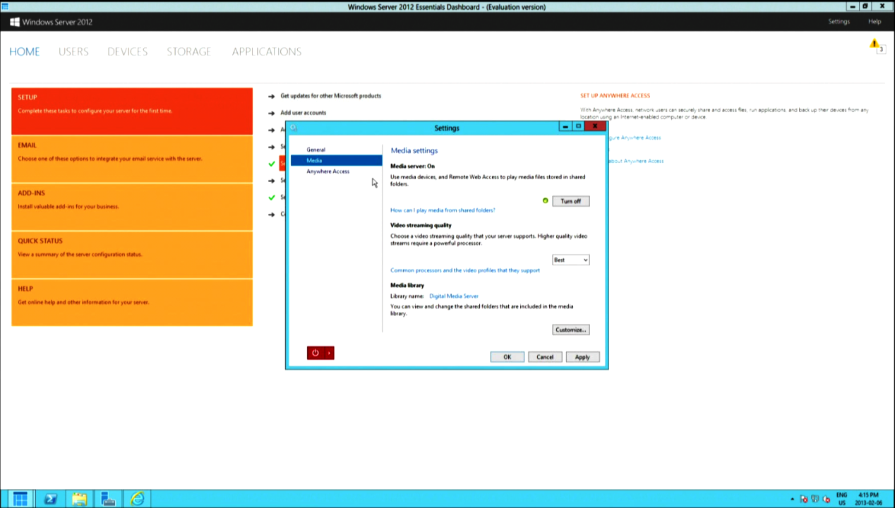 As a final check, go back to the Anywhere Access page. This time since we used the wizard, there will be a different overlay presented, but we can still access it. Click MEDIA to turn on local and remote streaming capabilities, and set the quality to BEST: