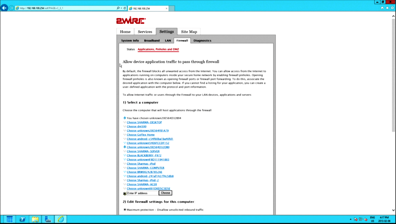 Our ISP is unfortunately linked to the awful 2WIRE 3801-HGV Gateway, which doesn’t support UPnP. Therefore, we need to access it first; the default IP if you have 2WIRE equipment is 192.168.100.254, so put that in your address bar. Go to SETTINGS, FIREWALL, APPLICATIONS: