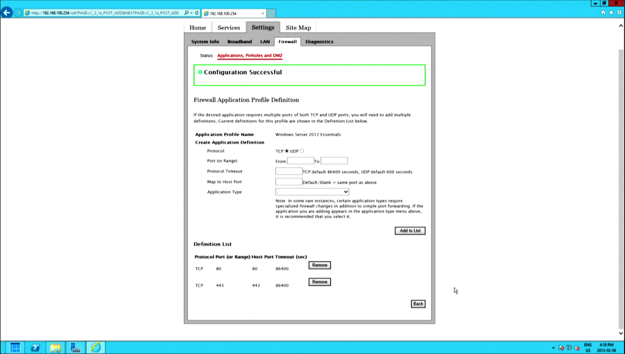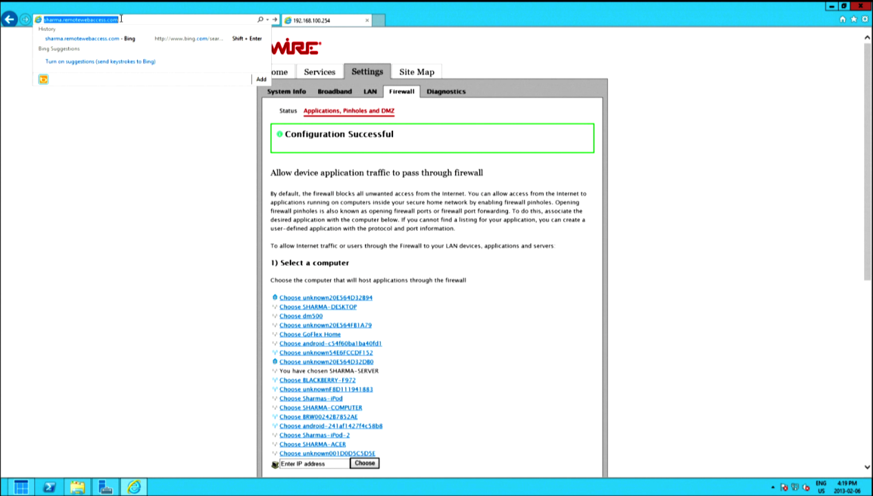 Click BACK, select your server name from the list of connected devices (SHARMA-SERVER for us). Filter applications by user-made, and select the custom application you just made above. ADD it to the HOSTED APPLICATIONS list and save. Remember that you will get errors adding the application to the list if you are currently forwarding either of the two listed ports. The 2WIRE will not allow simultaneous forwarding, so if you are forwarding either of the two on a different machine, you will need to remove them from that machine and assign to the server.