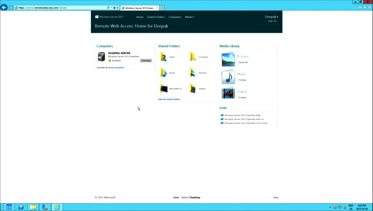 YAY! Everything is working fine! By default your SHARED FOLDERS are in the main C: drive of the server, so add all of your media in there and they server will catalogue it properly so it will show up here. Keep in mind that you can add other users and folders into the mix as well: