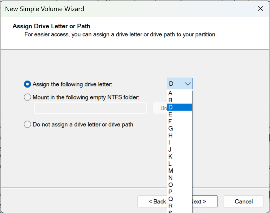 Personalize your SSD any further. If it is your primary drive, it will be ‘C:’. Other than that, the world is yours. Choose a drive letter. When is the last time we saw ‘A’ used as a drive letter. Yup…I am dating myself here. ‘A’ was the norm for 5 1/4″ and 3 1/2″ some time ago.