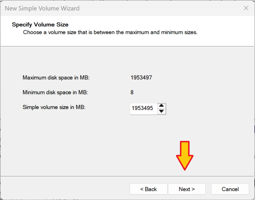 When you come to the Volume Size screen, it will be automatically set to the maximum megabyte size of your SSD and you don’t have to change it, simply select ‘Next’.