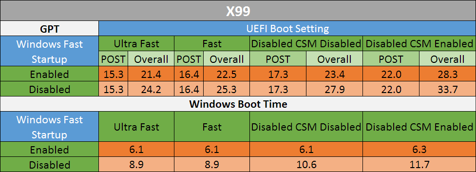 Our results are from taking the average of five system boots from powered off to desktop for each UEFI fast boot setting. During testing we noticed that we could disable CSM when fast boot was disabled and displayed the results as well. To show the benefit of Windows fast startup, we also included the results from having both enabled and disabled.