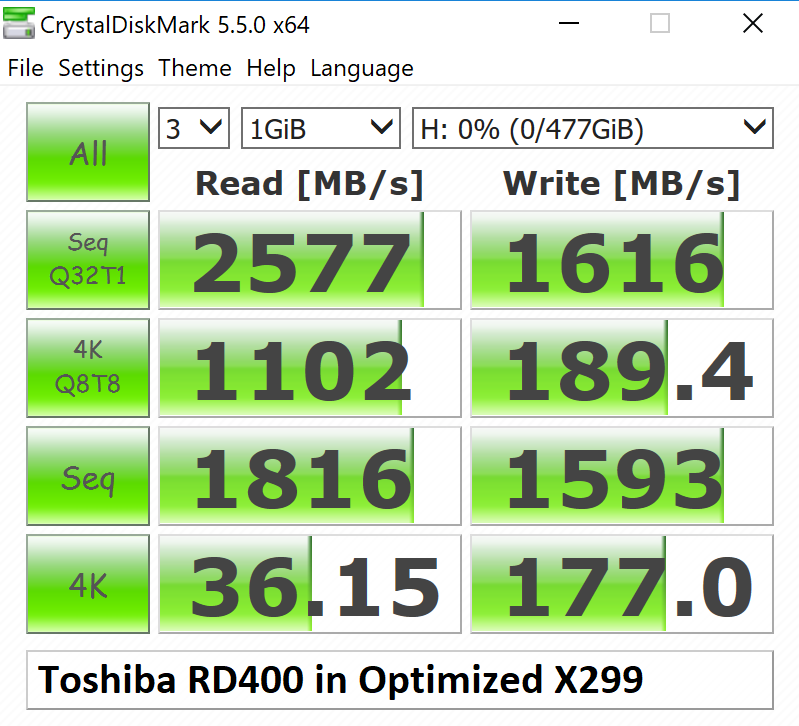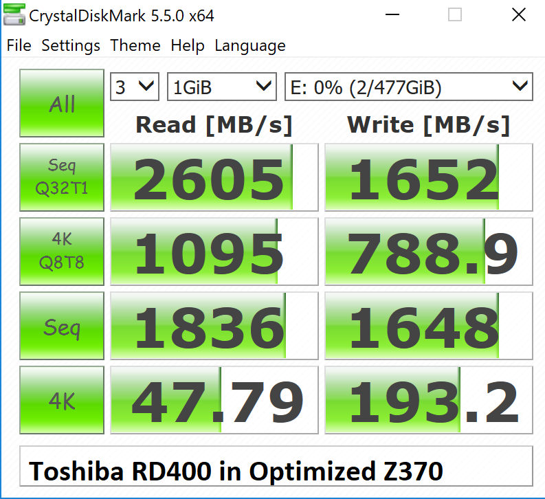 We wanted to find a good example where the right board can make all the difference in the world, and did so with the Toshiba RD 400. We tested this SSD with 5 separate 512GB RD400s and received the same result on each. Take a look…