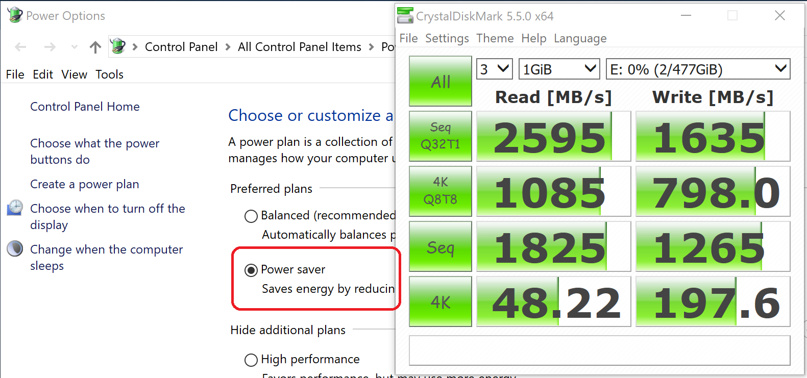 This is probably the biggest cause of SSDs not meeting manufacturers specifications once tested after a fresh OS installation. It is very easy to verlook as so many simply want to test their new SSD to confirm it is up to spec. Once again, let’s take a look with our RD400 NVMe SSD, but in Power Saver Mode to start: