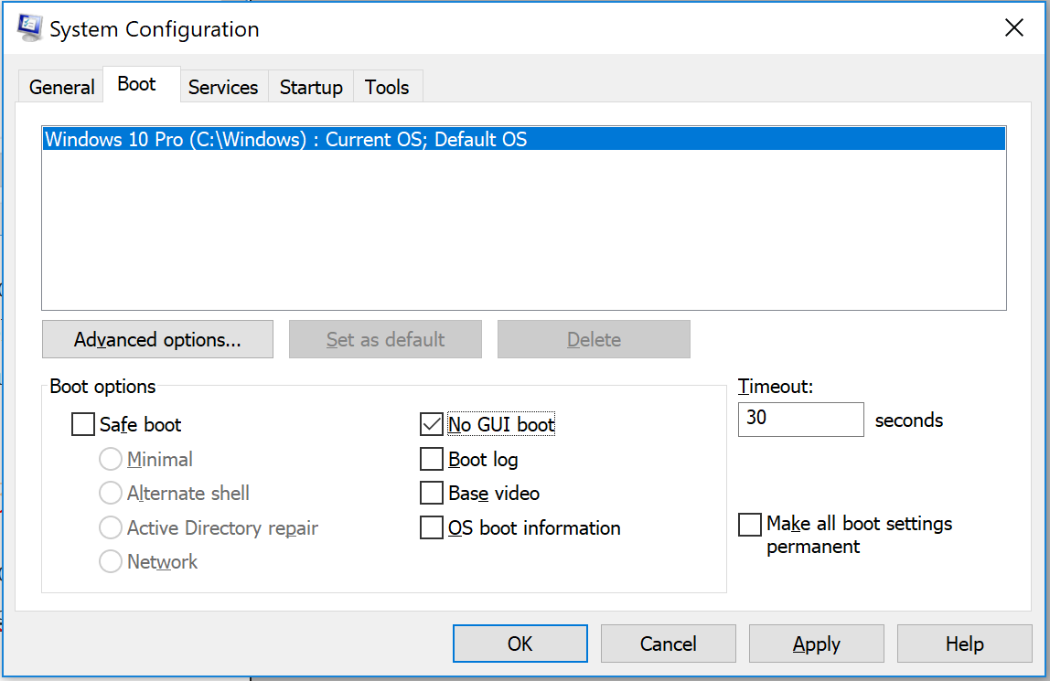 This selection disables the GUI start screen on boot, saving a few seconds during the boot process. Click the Windows key and ‘R’, and then type MSConfig. From there, select Boot, check ‘No GUI Boot’ and save.