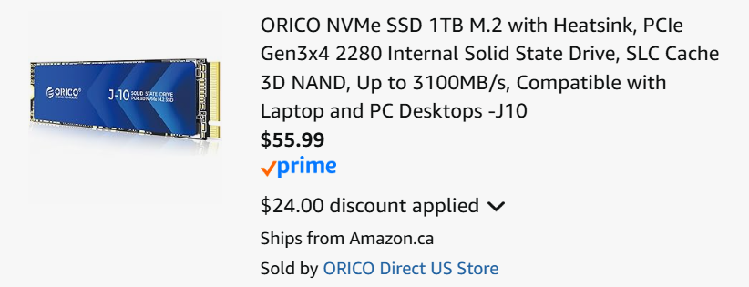 Dirt cheap on Amazon right now is the Orico Gen3 1TB M.2 SSD with heatsink for 79.99 plus 20% off, but you have to remember to select the 20% off option.