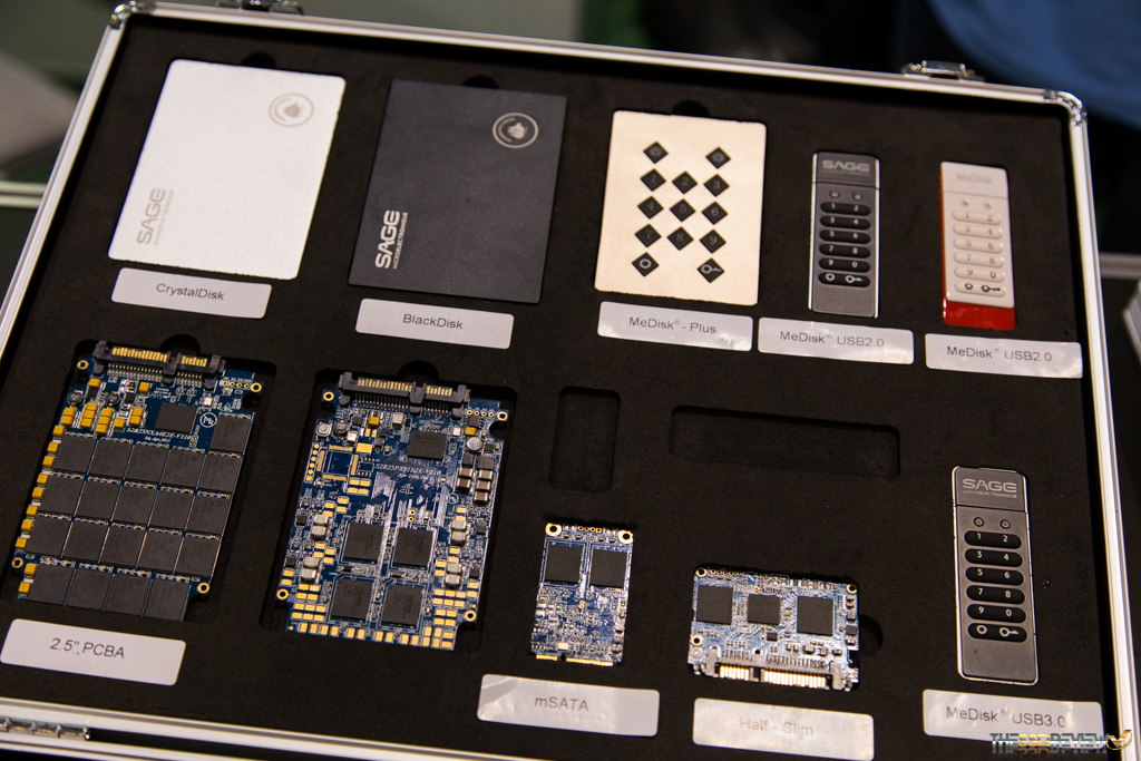 Sage Micro also showcased their Smart Destruction SSD, named the Natrium Disk, or NaDisk for short. Utilizing the S685 controller, the NaDisk provides hardware encryption and decryption engines to provide data protection. This can be triggered by a timer, button-press, software-command or mobile phone. This will completely erase the NaDisk, or if wanted it can also completely destroy the controller and NAND modules on board with a high-voltage shock. The drive is available in densities ranging from 8GB to 1TB, and is based upon a SATA 2 interface, which results in expected maximum read and write performance of 250 MB/s and 180 MB/s respectively.