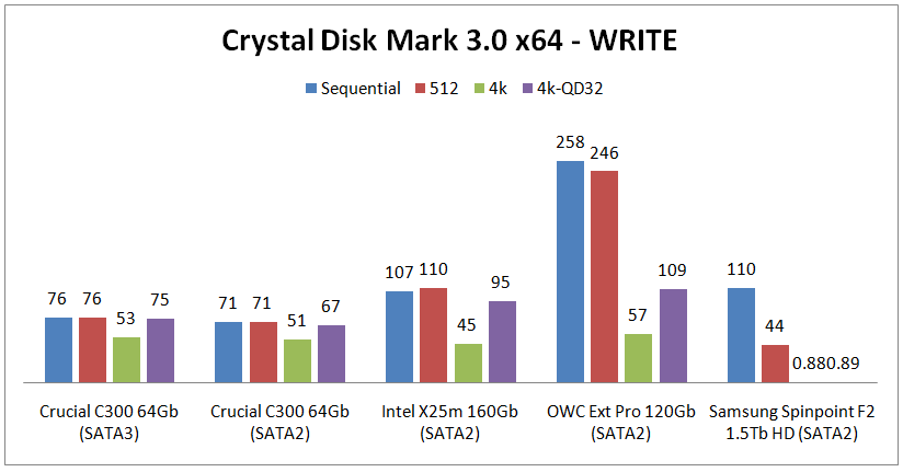 Now if you are reading this review and wondering just how much difference there is between a SSD and a hard drive, things might just be starting to fall into place. If we compare the 4k random write disk access speeds to that of the Samsung HDD (53 vs 0.88) and are remembering that the most visible improvement that you will see in your system comes from this, you will take note that the SSD is moving information 60 times faster than the hard drive. For those auto enthusiasts, that roughly a Volkswagon travelling at 10mph and being passed by someone going 600mph in a rocket trying for the land speed record.