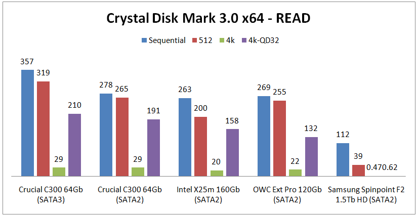 ATTO and HDTune Pro also show us that, regardless of whether it is in SATA 2 or SATA 3, the Crucial C300 rates higher in sequential read speeds than all of the other test drives. This chart does start to show us another little tidbit with respect to disk access time between SSDs and hard drives which is that SSDs have a much better disk access speed than hard drives. In this case, the Crucial C300 fares 192 times faster at disk access than the Samsung HDD (.1ms vs 19.2ms). Disk Access is the time it takes to find a piece of information stored on a storage medium. Things work a bit different with a SSD, as you can imagine, because there are no moving parts and information is then found and then retrieved in a steady flow. A hard disk, on the other hand, stores information on a magnetic platter which spins at very high speeds. An arm must pass over and find the exact spot through each pass. To add to this, the information is picked up in blocks at a time which, depending on the size of the file being retrieved, can stress the hard drive and reduce the speed itself.